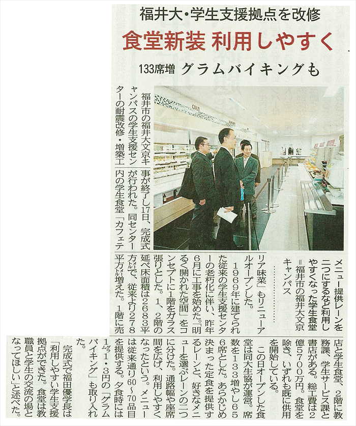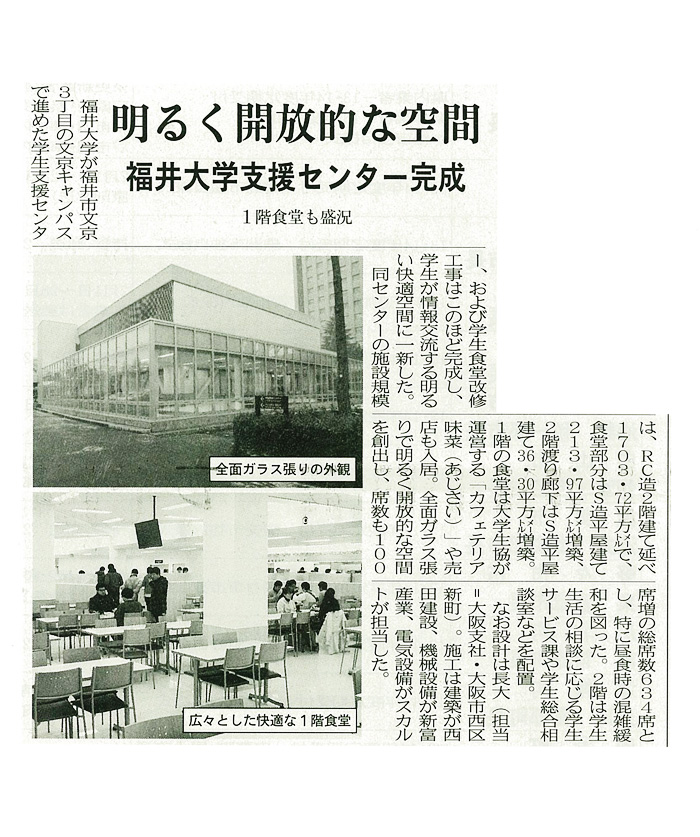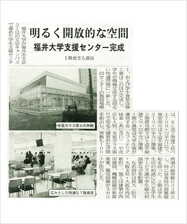 福井大学学生支援センターが完成しました。 明るく開放的なデザインの食堂・カフェテリアがオープンし今後、 多くの学生さんに利用して頂きたいです。