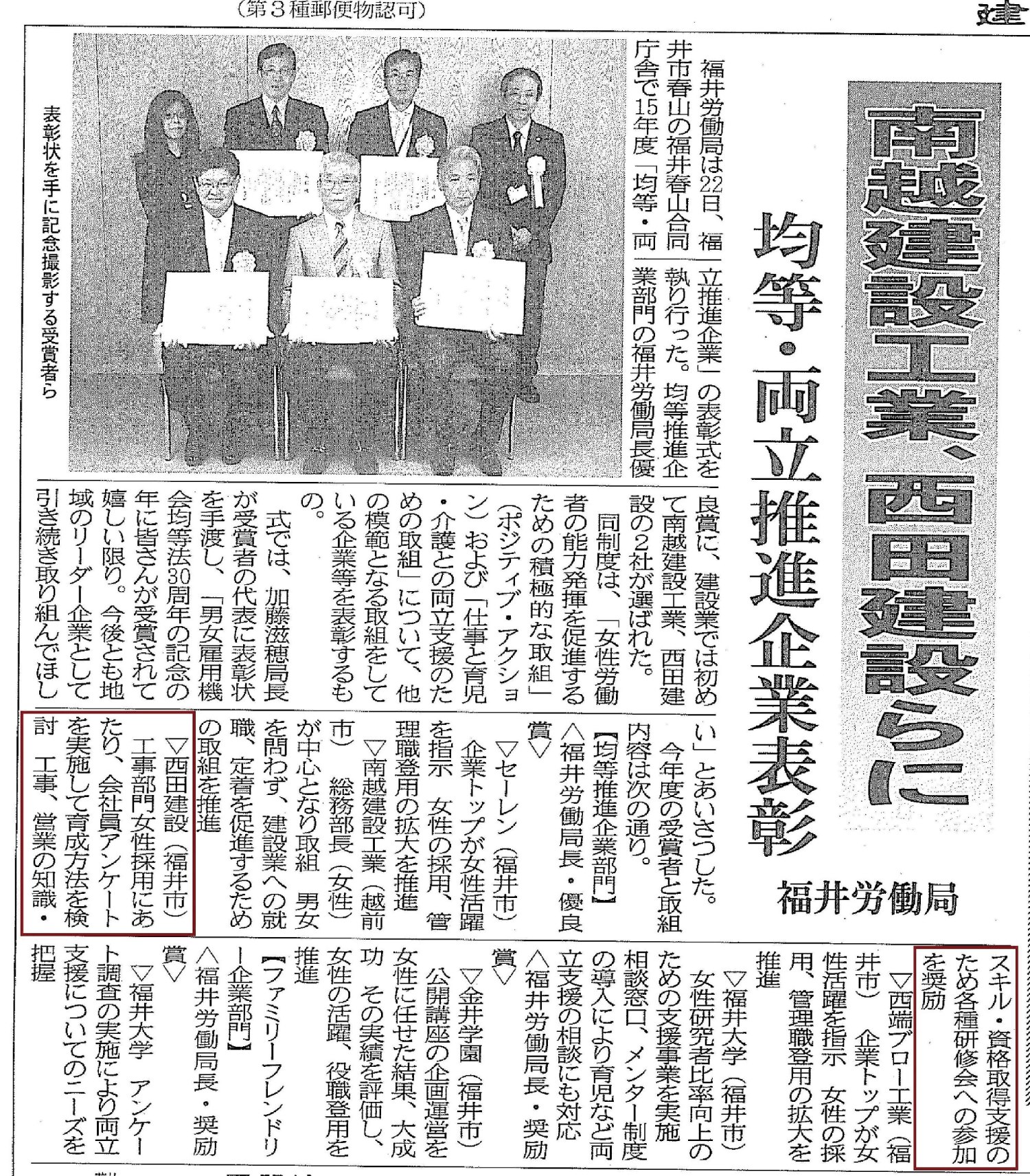 均等・両立推進企業表彰 均等推進企業部門で福井労働局長優良賞を受賞いたしました。