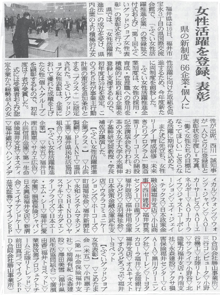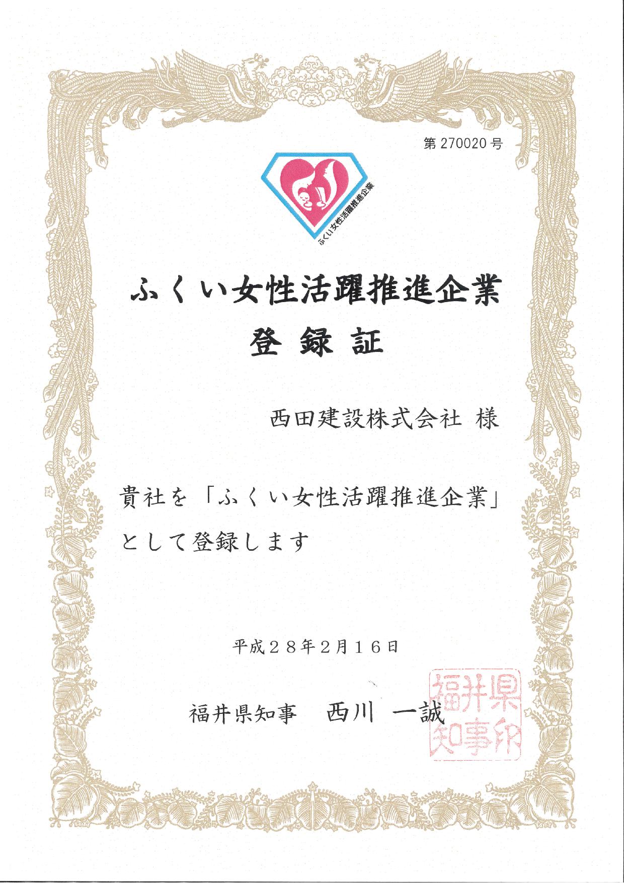 弊社は福井県の、「ふくい女性活躍推進企業」に登録しました。