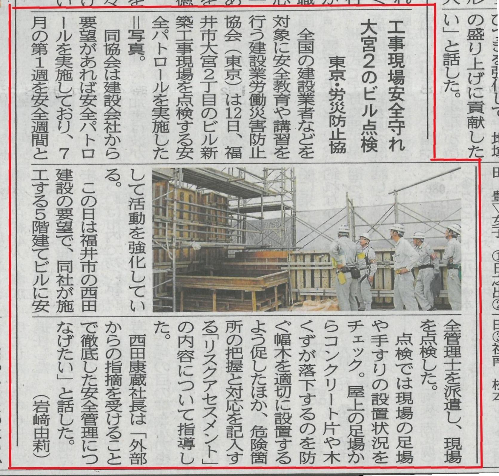 NEWS お知らせ TOP メディア掲載 建築工事安全パトロール*Nビル新築工事 建築工事安全パトロール*Nビル新築工事 2016.07.14 建設業労働災害防止協会様より、安全管理士 水野氏を派遣していただき、 Nビル新築工事現場にて、建築工事安全パトロールを実施しました。 毎月の社内安全パトロールとはまた違う、第三者目線でのアドバイスをいただきました。 今後も、災害防止に努めるべく現場内の改善に活用します。 福井新聞記事 建設工業新聞記事 戻る 一覧へ 次へ 新着情報 永平寺大燈籠流しの清掃に参加しました。 丸岡宿泊型自立訓練事業所新築工事を受注しました。 小松(7)宿舎改修建築その1 を受注しました。 福井警察署 森田交番新築工事を受注しました。 公益財団法人 全国法人会総連合様から表彰されました カテゴリ インターンシップ 採用情報 現場見学会 メディア掲載 講演活動 令和7年度 令和6年度 令和5年度 令和4年度 令和3年度 令和2年度 令和元年度 平成30年度 平成29年度 平成28年度 平成27年度 平成26年度 平成25年度 平成24年度 平成23年度 アーカイブ 2025 (10) 2024 (30) 2023 (24) 2022 (21) 2021 (24) 2020 (30) 2019 (58) 2018 (57) 2017 (39) 2016 (34) 2015 (22) 2014 (14) 2013 (14) 2012 (11) 2011 (7) 新着情報 永平寺大燈籠流しの清掃に参加しました。 丸岡宿泊型自立訓練事業所新築工事を受注しました。 小松(7)宿舎改修建築その1 を受注しました。 福井警察署 森田交番新築工事を受注しました。 公益財団法人 全国法人会総連合様から表彰されました カテゴリ インターンシップ 採用情報 現場見学会 メディア掲載 講演活動 令和7年度 令和6年度 令和5年度 令和4年度 令和3年度 令和2年度 令和元年度 平成30年度 平成29年度 平成28年度 平成27年度 平成26年度 平成25年度 平成24年度 平成23年度 アーカイブ 2025 (10) 2024 (30) 2023 (24) 2022 (21) 2021 (24) 2020 (30) 2019 (58) 2018 (57) 2017 (39) 2016 (34) 2015 (22) 2014 (14) 2013 (14) 2012 (11) 2011 (7)