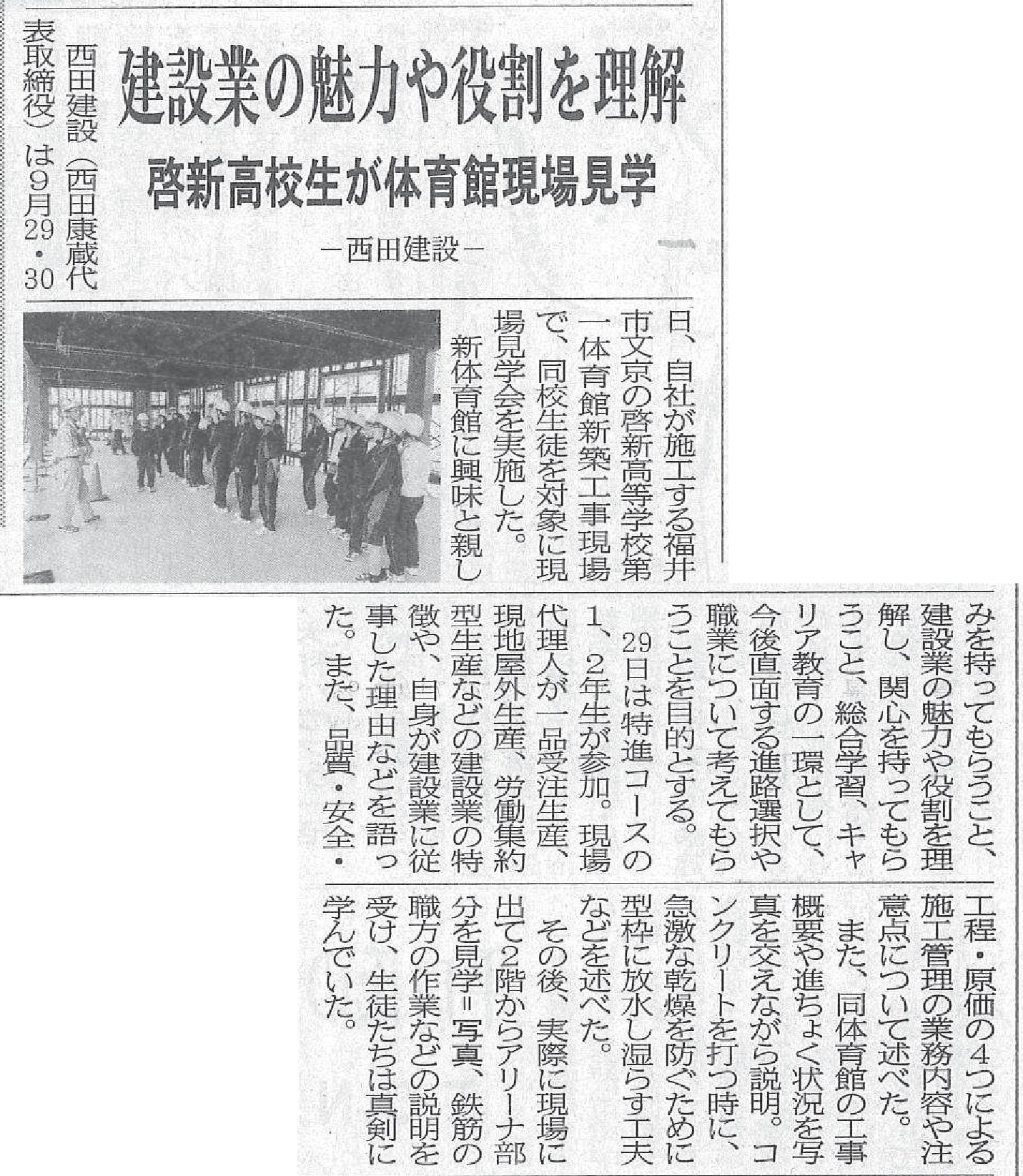 「啓新高等学校第1体育館改築工事」現場見学会を開催しました。 啓新高校の生徒さん達に建設業に魅力と関心を持ってもらい、 新体育館に興味と親しみを持ってもらう目的とし、 工事状況を見学していただきました。
