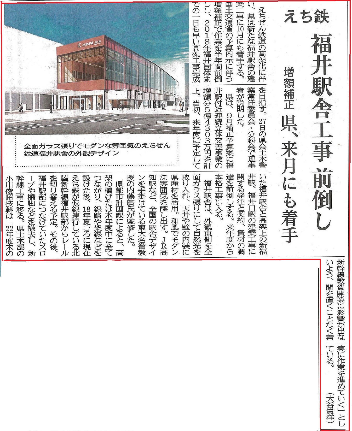 NEWS お知らせ TOP メディア掲載 えちぜん鉄道、福井駅外2新築 受注しました えちぜん鉄道、福井駅外2新築 受注しました 2016.10.12 えちぜん鉄道 福井駅・新福井駅・福井口駅の新築工事を受注しました。 地域の皆様に愛される建物になるよう、尽力いたします。 戻る 一覧へ 次へ 新着情報 永平寺大燈籠流しの清掃に参加しました。 丸岡宿泊型自立訓練事業所新築工事を受注しました。 小松(7)宿舎改修建築その1 を受注しました。 福井警察署 森田交番新築工事を受注しました。 公益財団法人 全国法人会総連合様から表彰されました カテゴリ インターンシップ 採用情報 現場見学会 メディア掲載 講演活動 令和7年度 令和6年度 令和5年度 令和4年度 令和3年度 令和2年度 令和元年度 平成30年度 平成29年度 平成28年度 平成27年度 平成26年度 平成25年度 平成24年度 平成23年度 アーカイブ 2025 (10) 2024 (30) 2023 (24) 2022 (21) 2021 (24) 2020 (30) 2019 (58) 2018 (57) 2017 (39) 2016 (34) 2015 (22) 2014 (14) 2013 (14) 2012 (11) 2011 (7) 新着情報 永平寺大燈籠流しの清掃に参加しました。 丸岡宿泊型自立訓練事業所新築工事を受注しました。 小松(7)宿舎改修建築その1 を受注しました。 福井警察署 森田交番新築工事を受注しました。 公益財団法人 全国法人会総連合様から表彰されました カテゴリ インターンシップ 採用情報 現場見学会 メディア掲載 講演活動 令和7年度 令和6年度 令和5年度 令和4年度 令和3年度 令和2年度 令和元年度 平成30年度 平成29年度 平成28年度 平成27年度 平成26年度 平成25年度 平成24年度 平成23年度 アーカイブ 2025 (10) 2024 (30) 2023 (24) 2022 (21) 2021 (24) 2020 (30) 2019 (58) 2018 (57) 2017 (39) 2016 (34) 2015 (22) 2014 (14) 2013 (14) 2012 (11) 2011 (7)