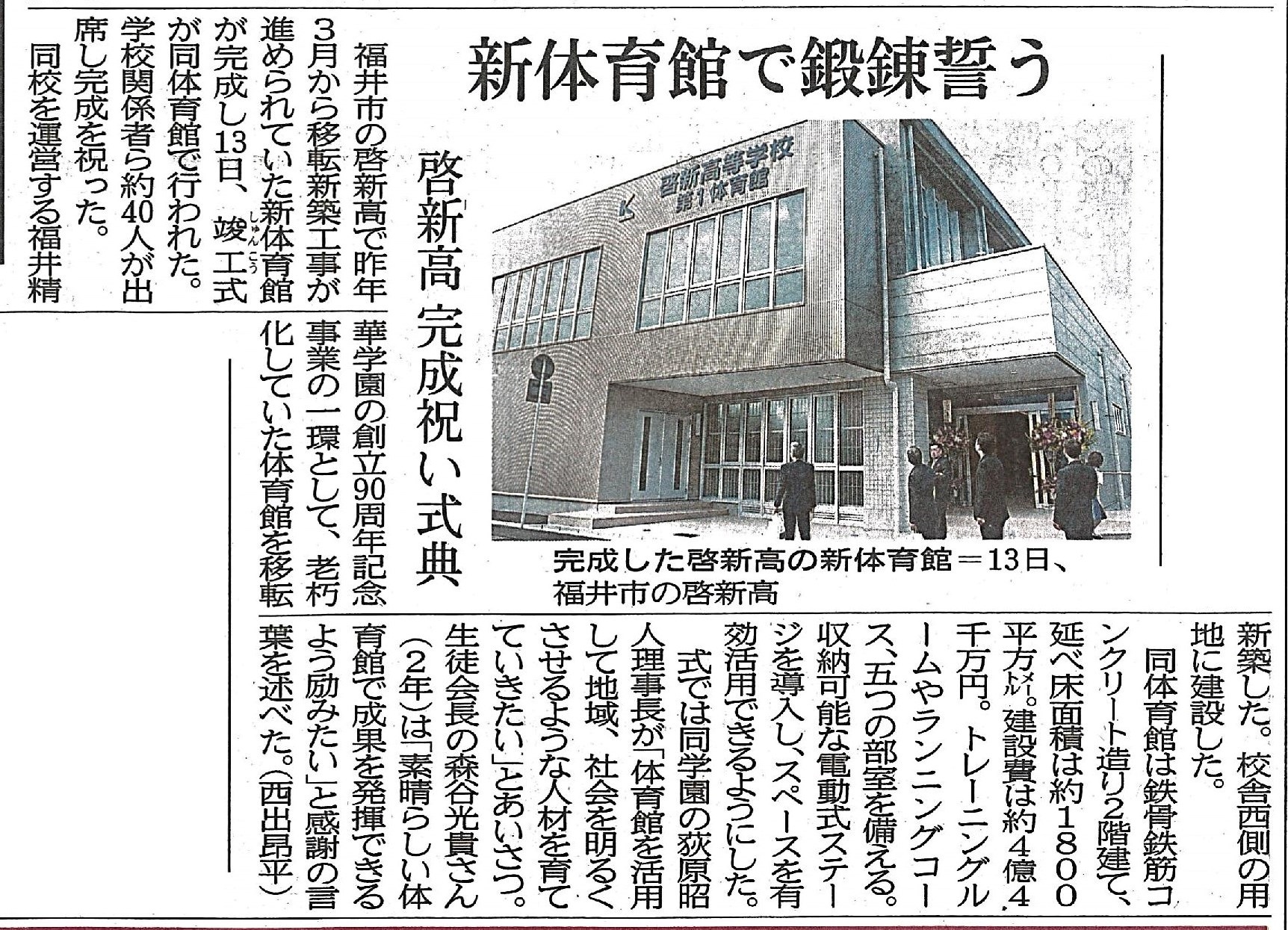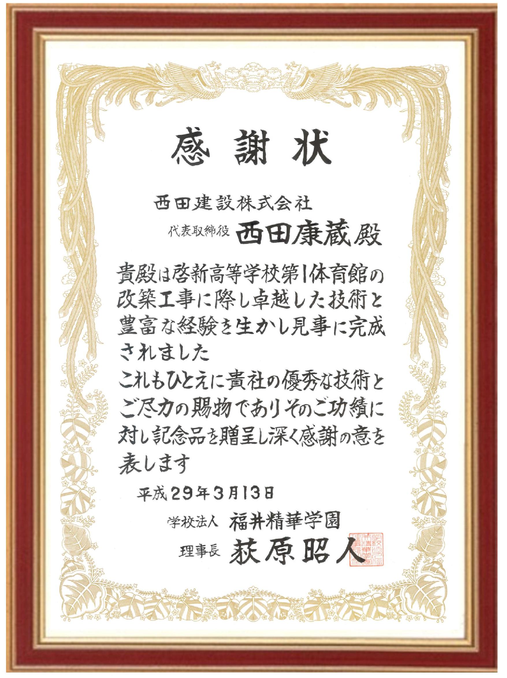 啓新高等学校第1体育館の竣工式が行われ、 学校法人福井精華学園様より感謝状をいただきました。