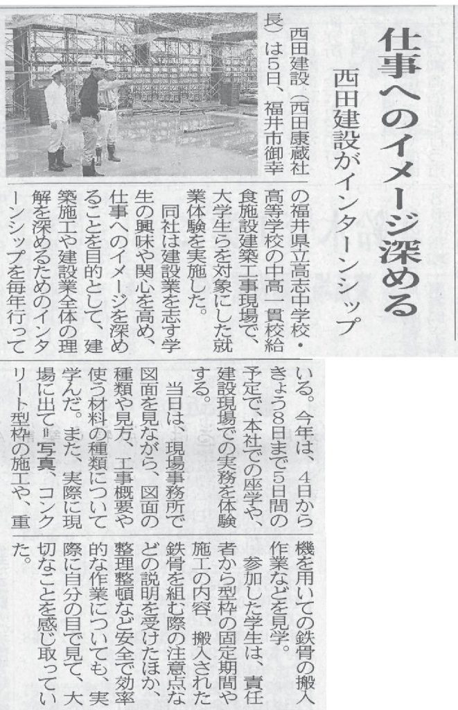 NEWS お知らせ TOP インターンシップ 平成29年度 インターンシップ研修を行いました 平成29年度 インターンシップ研修を行いました 2017.09.12 9月4日~9月8日の5日間 大学生2名が参加して、 インターンシップ研修を行いました。 社内での座学講座、現場見学や作業体験を通して 建築業・建築施工に関して学んでいただきました。 建設工業新聞記事 *現場見学* レベル実習・鉄筋ガス圧接工事 基礎工事 制震ブレース工事 シェルター工事 ランチミーティング 戻る 一覧へ 次へ 新着情報 永平寺大燈籠流しの清掃に参加しました。 丸岡宿泊型自立訓練事業所新築工事を受注しました。 小松(7)宿舎改修建築その1 を受注しました。 福井警察署 森田交番新築工事を受注しました。 公益財団法人 全国法人会総連合様から表彰されました カテゴリ インターンシップ 採用情報 現場見学会 メディア掲載 講演活動 令和7年度 令和6年度 令和5年度 令和4年度 令和3年度 令和2年度 令和元年度 平成30年度 平成29年度 平成28年度 平成27年度 平成26年度 平成25年度 平成24年度 平成23年度 アーカイブ 2025 (10) 2024 (30) 2023 (24) 2022 (21) 2021 (24) 2020 (30) 2019 (58) 2018 (57) 2017 (39) 2016 (34) 2015 (22) 2014 (14) 2013 (14) 2012 (11) 2011 (7) 新着情報 永平寺大燈籠流しの清掃に参加しました。 丸岡宿泊型自立訓練事業所新築工事を受注しました。 小松(7)宿舎改修建築その1 を受注しました。 福井警察署 森田交番新築工事を受注しました。 公益財団法人 全国法人会総連合様から表彰されました カテゴリ インターンシップ 採用情報 現場見学会 メディア掲載 講演活動 令和7年度 令和6年度 令和5年度 令和4年度 令和3年度 令和2年度 令和元年度 平成30年度 平成29年度 平成28年度 平成27年度 平成26年度 平成25年度 平成24年度 平成23年度 アーカイブ 2025 (10) 2024 (30) 2023 (24) 2022 (21) 2021 (24) 2020 (30) 2019 (58) 2018 (57) 2017 (39) 2016 (34) 2015 (22) 2014 (14) 2013 (14) 2012 (11) 2011 (7)