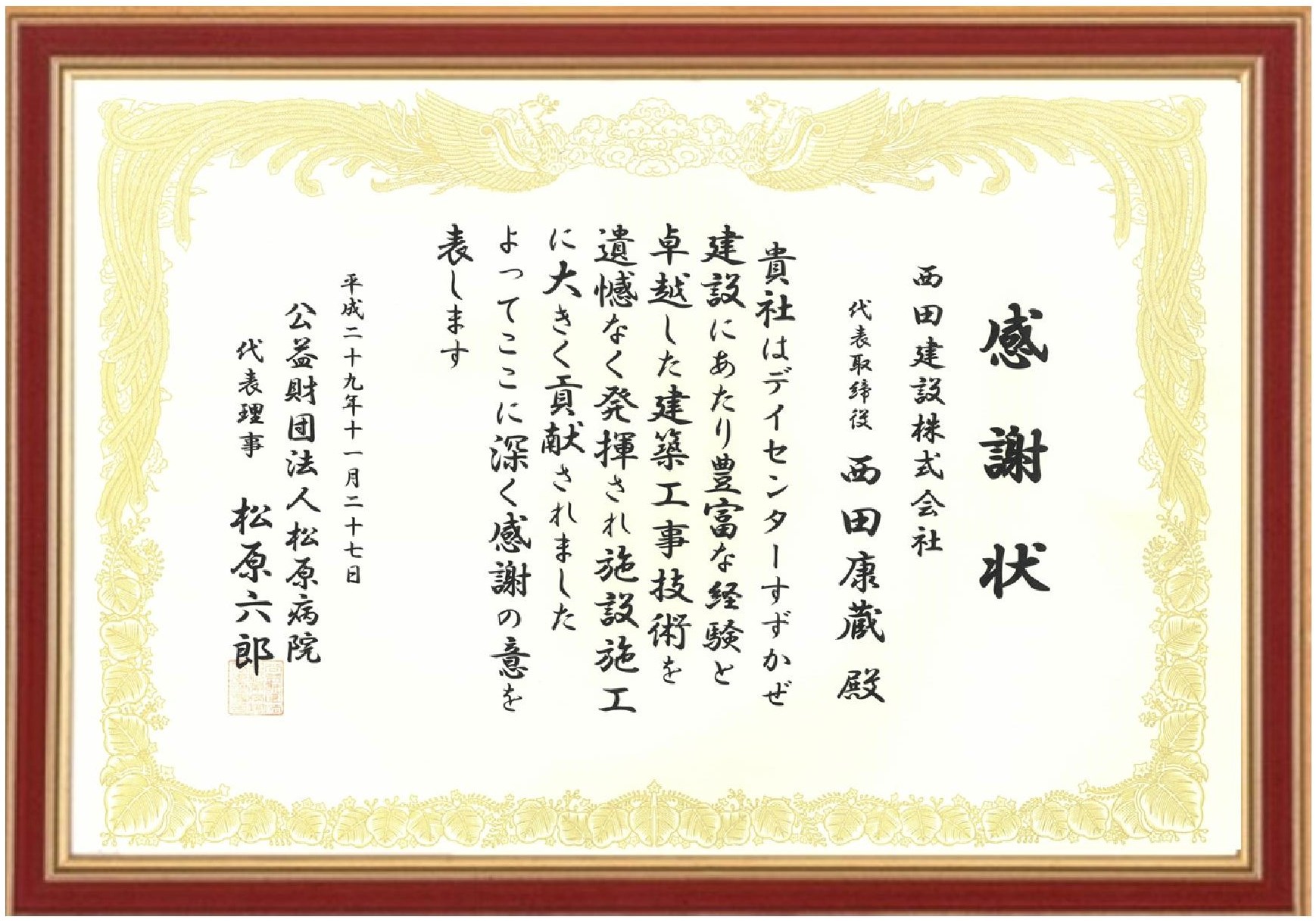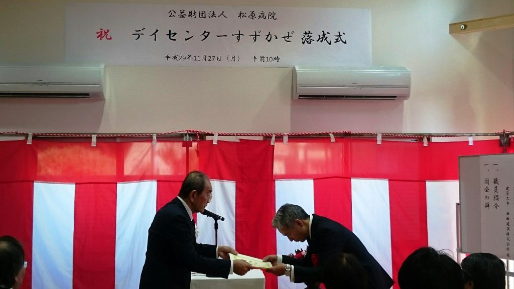デイセンターすずかぜの落成式が行われ、 公益財団法人松原病院様より感謝状をいただきました。