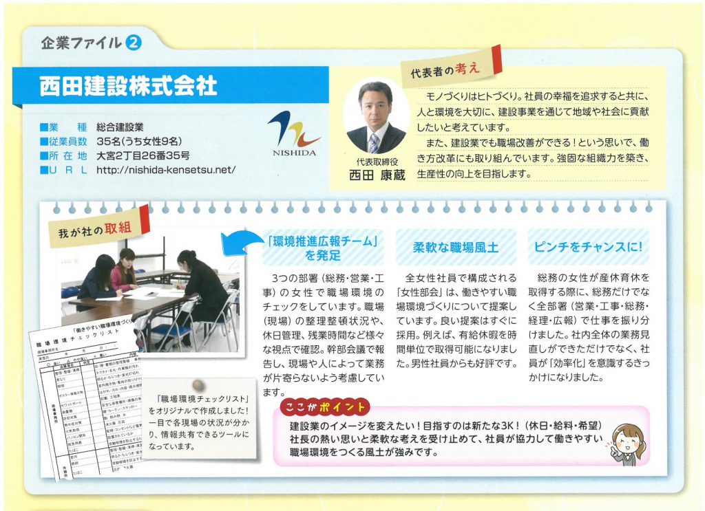 福井市子育てファミリー応援企業 リポートⅡ ワーク・ライフ・バランスで職場が変わる!に、 仕事と子育てが両立できる職場づくりに取り組む企業として 紹介されました。