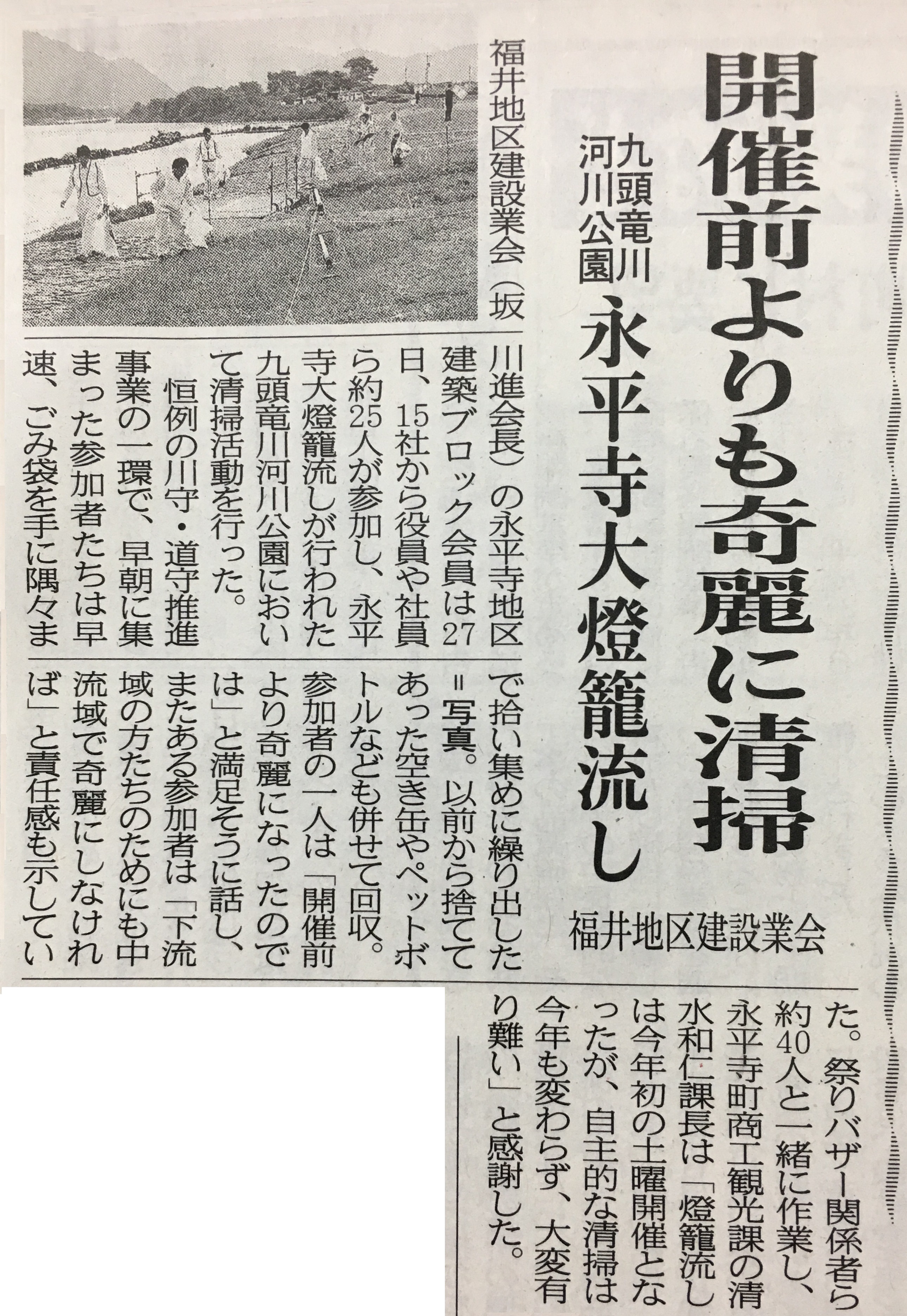 NEWS お知らせ TOP 平成30年度 *川守事業*永平寺大灯篭流し会場の清掃を行いました。 *川守事業*永平寺大灯篭流し会場の清掃を行いました。 2018.08.28 川守推進事業の一環として、 永平寺灯篭流し会場の清掃に参加しました。 建設工業新聞より 戻る 一覧へ 次へ 新着情報 永平寺大燈籠流しの清掃に参加しました。 丸岡宿泊型自立訓練事業所新築工事を受注しました。 小松(7)宿舎改修建築その1 を受注しました。 福井警察署 森田交番新築工事を受注しました。 公益財団法人 全国法人会総連合様から表彰されました カテゴリ インターンシップ 採用情報 現場見学会 メディア掲載 講演活動 令和7年度 令和6年度 令和5年度 令和4年度 令和3年度 令和2年度 令和元年度 平成30年度 平成29年度 平成28年度 平成27年度 平成26年度 平成25年度 平成24年度 平成23年度 アーカイブ 2025 (10) 2024 (30) 2023 (24) 2022 (21) 2021 (24) 2020 (30) 2019 (58) 2018 (57) 2017 (39) 2016 (34) 2015 (22) 2014 (14) 2013 (14) 2012 (11) 2011 (7) 新着情報 永平寺大燈籠流しの清掃に参加しました。 丸岡宿泊型自立訓練事業所新築工事を受注しました。 小松(7)宿舎改修建築その1 を受注しました。 福井警察署 森田交番新築工事を受注しました。 公益財団法人 全国法人会総連合様から表彰されました カテゴリ インターンシップ 採用情報 現場見学会 メディア掲載 講演活動 令和7年度 令和6年度 令和5年度 令和4年度 令和3年度 令和2年度 令和元年度 平成30年度 平成29年度 平成28年度 平成27年度 平成26年度 平成25年度 平成24年度 平成23年度 アーカイブ 2025 (10) 2024 (30) 2023 (24) 2022 (21) 2021 (24) 2020 (30) 2019 (58) 2018 (57) 2017 (39) 2016 (34) 2015 (22) 2014 (14) 2013 (14) 2012 (11) 2011 (7)