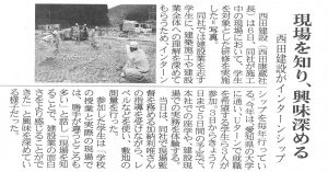NEWS お知らせ TOP インターンシップ 平成30年度 インターンシップ研修を行いました 平成30年度 インターンシップ研修を行いました 2018.09.19 9月3日~9月7日の5日間 大学や高専の学生3名が参加して インターンシップ研修を行いました。 台風の影響で、予定を変更することとなりましたが、 無事に現場実習を終えることができました。 参加してくれた学生からは、 「建設業のイメージが変わり興味が湧きました。」 などとお声をいただき弊社としても嬉しい限りです。 今回参加いただきました学生のみなさん、 またご協力いただいた協力業者の方々、工事部の皆様、 ありがとうございました(^^)/ 建設工業新聞記事 研修の様子 戻る 一覧へ 次へ 新着情報 永平寺大燈籠流しの清掃に参加しました。 丸岡宿泊型自立訓練事業所新築工事を受注しました。 小松(7)宿舎改修建築その1 を受注しました。 福井警察署 森田交番新築工事を受注しました。 公益財団法人 全国法人会総連合様から表彰されました カテゴリ インターンシップ 採用情報 現場見学会 メディア掲載 講演活動 令和7年度 令和6年度 令和5年度 令和4年度 令和3年度 令和2年度 令和元年度 平成30年度 平成29年度 平成28年度 平成27年度 平成26年度 平成25年度 平成24年度 平成23年度 アーカイブ 2025 (10) 2024 (30) 2023 (24) 2022 (21) 2021 (24) 2020 (30) 2019 (58) 2018 (57) 2017 (39) 2016 (34) 2015 (22) 2014 (14) 2013 (14) 2012 (11) 2011 (7) 新着情報 永平寺大燈籠流しの清掃に参加しました。 丸岡宿泊型自立訓練事業所新築工事を受注しました。 小松(7)宿舎改修建築その1 を受注しました。 福井警察署 森田交番新築工事を受注しました。 公益財団法人 全国法人会総連合様から表彰されました カテゴリ インターンシップ 採用情報 現場見学会 メディア掲載 講演活動 令和7年度 令和6年度 令和5年度 令和4年度 令和3年度 令和2年度 令和元年度 平成30年度 平成29年度 平成28年度 平成27年度 平成26年度 平成25年度 平成24年度 平成23年度 アーカイブ 2025 (10) 2024 (30) 2023 (24) 2022 (21) 2021 (24) 2020 (30) 2019 (58) 2018 (57) 2017 (39) 2016 (34) 2015 (22) 2014 (14) 2013 (14) 2012 (11) 2011 (7)