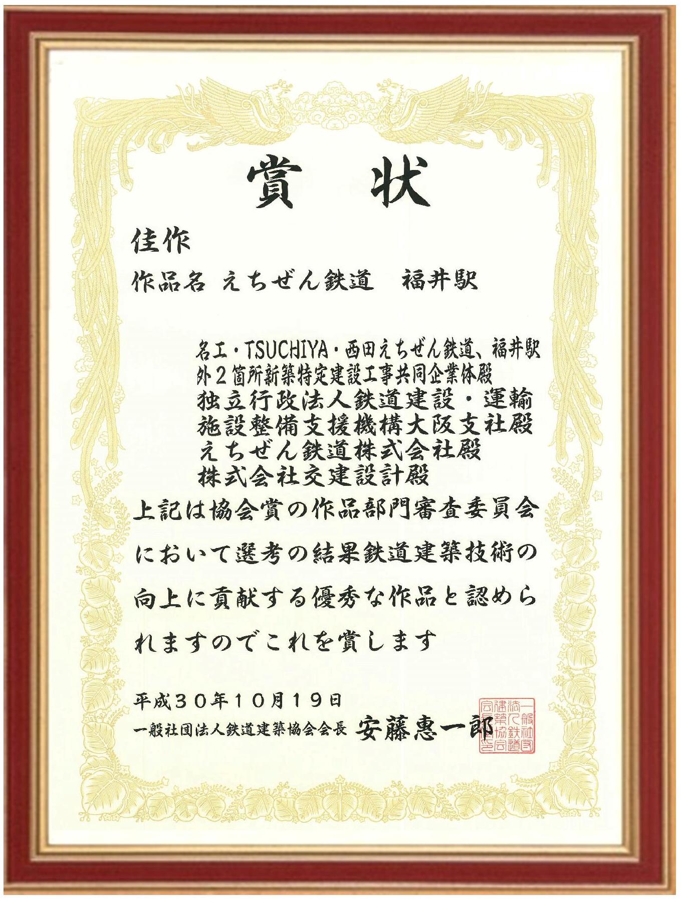 NEWS お知らせ TOP 平成30年度 鉄道建築技術 協会賞に入賞しました。 鉄道建築技術 協会賞に入賞しました。 2018.10.20 ”えちぜん鉄道 福井駅”が (一社)鉄道建築協会より 鉄道建築技術の向上に貢献する優秀な作品として 入賞しました。 戻る 一覧へ 次へ 新着情報 永平寺大燈籠流しの清掃に参加しました。 丸岡宿泊型自立訓練事業所新築工事を受注しました。 小松(7)宿舎改修建築その1 を受注しました。 福井警察署 森田交番新築工事を受注しました。 公益財団法人 全国法人会総連合様から表彰されました カテゴリ インターンシップ 採用情報 現場見学会 メディア掲載 講演活動 令和7年度 令和6年度 令和5年度 令和4年度 令和3年度 令和2年度 令和元年度 平成30年度 平成29年度 平成28年度 平成27年度 平成26年度 平成25年度 平成24年度 平成23年度 アーカイブ 2025 (10) 2024 (30) 2023 (24) 2022 (21) 2021 (24) 2020 (30) 2019 (58) 2018 (57) 2017 (39) 2016 (34) 2015 (22) 2014 (14) 2013 (14) 2012 (11) 2011 (7) 新着情報 永平寺大燈籠流しの清掃に参加しました。 丸岡宿泊型自立訓練事業所新築工事を受注しました。 小松(7)宿舎改修建築その1 を受注しました。 福井警察署 森田交番新築工事を受注しました。 公益財団法人 全国法人会総連合様から表彰されました カテゴリ インターンシップ 採用情報 現場見学会 メディア掲載 講演活動 令和7年度 令和6年度 令和5年度 令和4年度 令和3年度 令和2年度 令和元年度 平成30年度 平成29年度 平成28年度 平成27年度 平成26年度 平成25年度 平成24年度 平成23年度 アーカイブ 2025 (10) 2024 (30) 2023 (24) 2022 (21) 2021 (24) 2020 (30) 2019 (58) 2018 (57) 2017 (39) 2016 (34) 2015 (22) 2014 (14) 2013 (14) 2012 (11) 2011 (7)