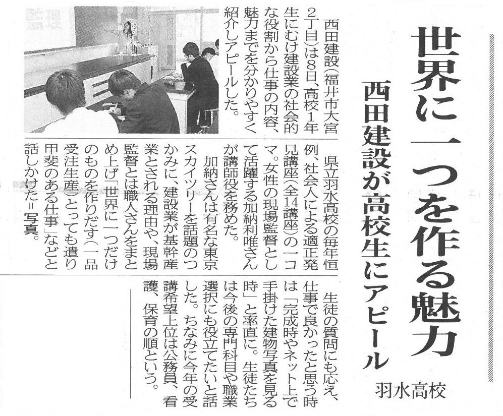 羽水高校にて「社会人講師による適正発見講座」が開催され、 講師として参加させていただきました。     生徒さんの感想はこちら。 また、講座の様子が建設工業新聞に掲載されました。
