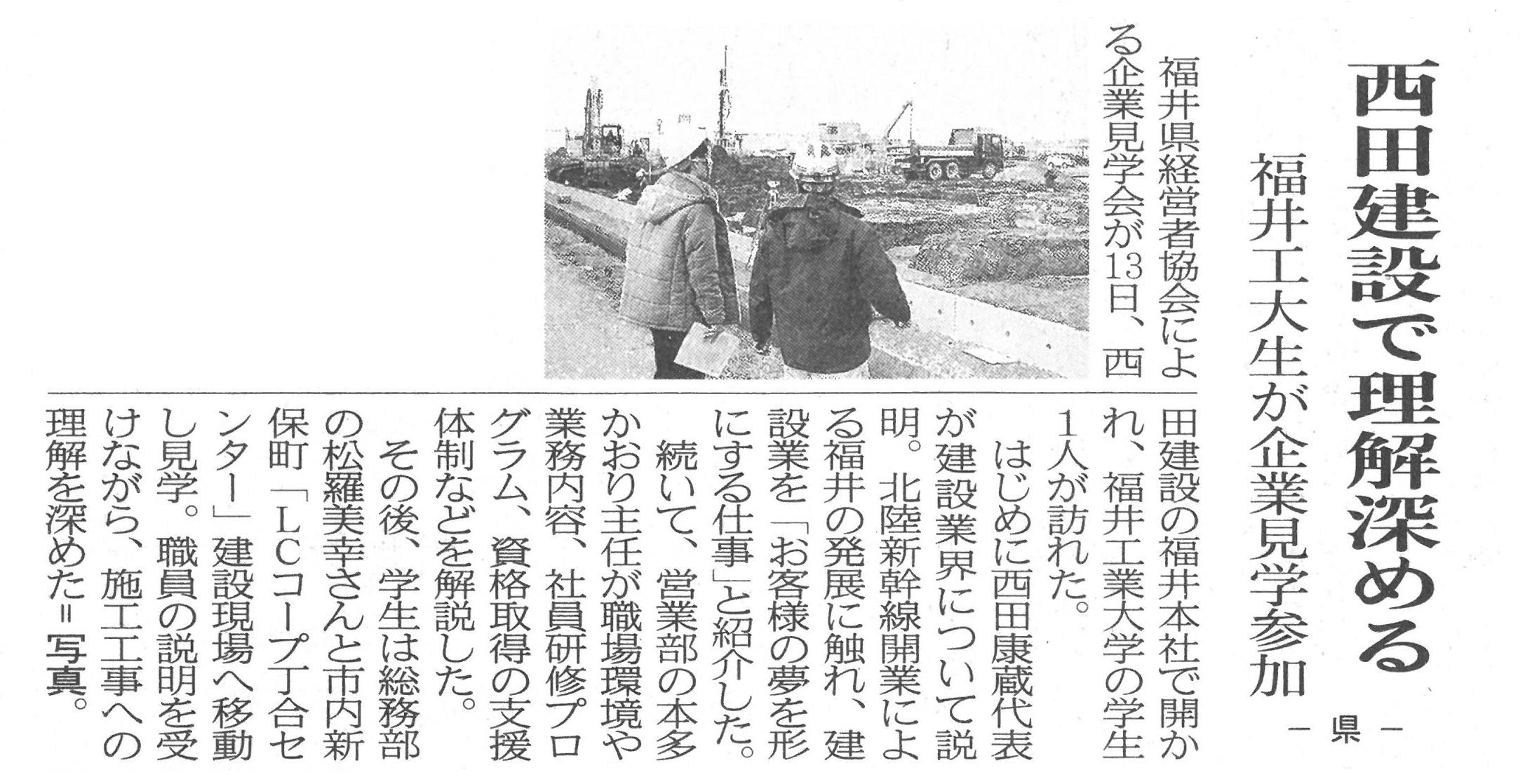 福井県経営者協会 主催の 大学1・2年生、短大1年生を対象とした 1day企業見学会を行いました。     就職活動に先駆けて興味のある職種の特徴や、 会社の仕組みを知り、今後の活動に活かして欲しいと思います。   建設工業新聞