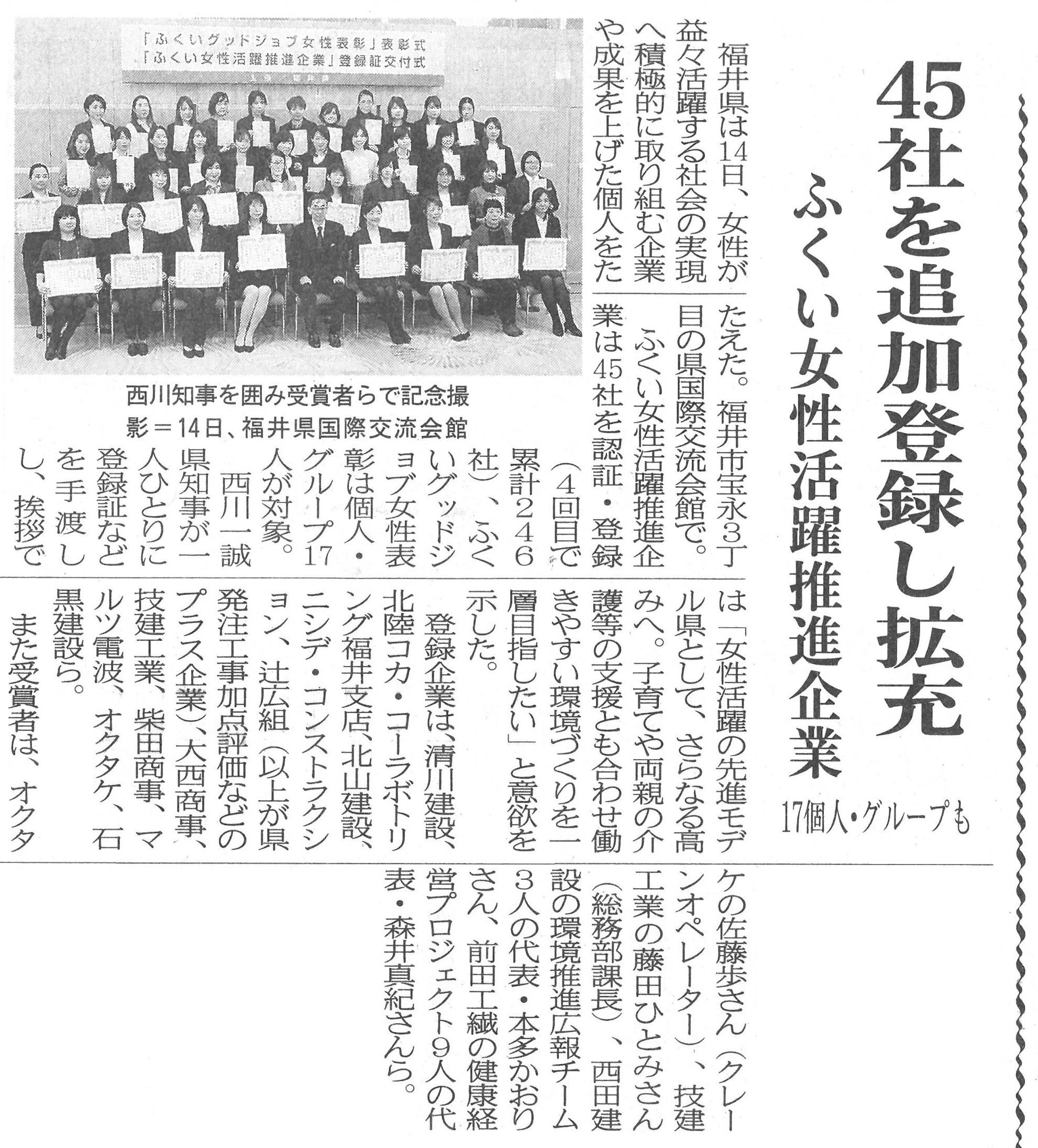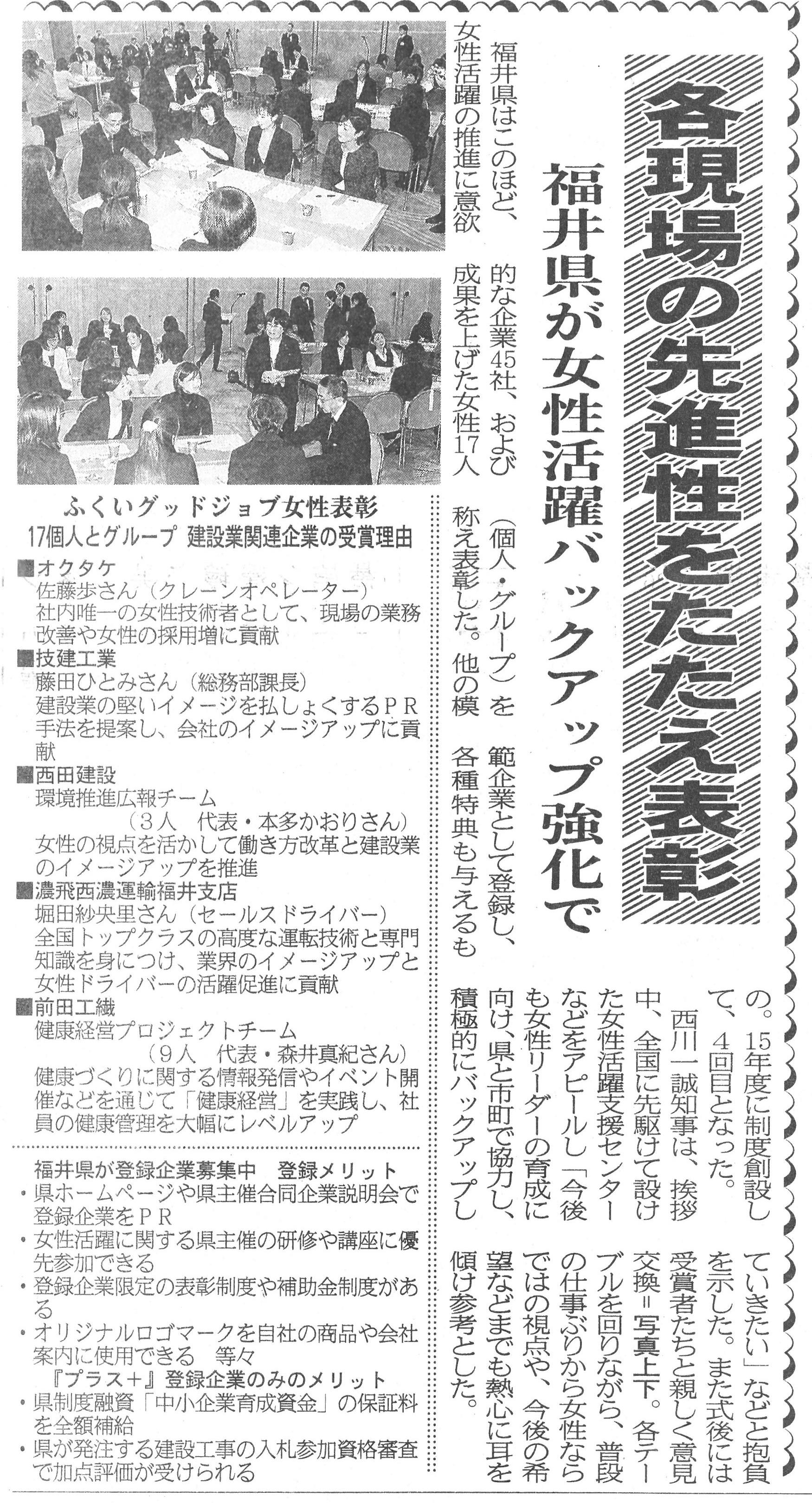 NEWS お知らせ TOP メディア掲載 福井県より、グットジョブ女性表彰を受けました。 福井県より、グットジョブ女性表彰を受けました。 2019.02.19 弊社の女性チームが福井県より、 グットジョブ女性表彰を受けました。 国際交流会館にて表彰式があり、 参加させていただきました。 表彰式の後、グループワークをおこない 各企業の取組について意見交換をしました。 建設工業新聞 福井新聞 戻る 一覧へ 次へ 新着情報 永平寺大燈籠流しの清掃に参加しました。 丸岡宿泊型自立訓練事業所新築工事を受注しました。 小松(7)宿舎改修建築その1 を受注しました。 福井警察署 森田交番新築工事を受注しました。 公益財団法人 全国法人会総連合様から表彰されました カテゴリ インターンシップ 採用情報 現場見学会 メディア掲載 講演活動 令和7年度 令和6年度 令和5年度 令和4年度 令和3年度 令和2年度 令和元年度 平成30年度 平成29年度 平成28年度 平成27年度 平成26年度 平成25年度 平成24年度 平成23年度 アーカイブ 2025 (10) 2024 (30) 2023 (24) 2022 (21) 2021 (24) 2020 (30) 2019 (58) 2018 (57) 2017 (39) 2016 (34) 2015 (22) 2014 (14) 2013 (14) 2012 (11) 2011 (7) 新着情報 永平寺大燈籠流しの清掃に参加しました。 丸岡宿泊型自立訓練事業所新築工事を受注しました。 小松(7)宿舎改修建築その1 を受注しました。 福井警察署 森田交番新築工事を受注しました。 公益財団法人 全国法人会総連合様から表彰されました カテゴリ インターンシップ 採用情報 現場見学会 メディア掲載 講演活動 令和7年度 令和6年度 令和5年度 令和4年度 令和3年度 令和2年度 令和元年度 平成30年度 平成29年度 平成28年度 平成27年度 平成26年度 平成25年度 平成24年度 平成23年度 アーカイブ 2025 (10) 2024 (30) 2023 (24) 2022 (21) 2021 (24) 2020 (30) 2019 (58) 2018 (57) 2017 (39) 2016 (34) 2015 (22) 2014 (14) 2013 (14) 2012 (11) 2011 (7)