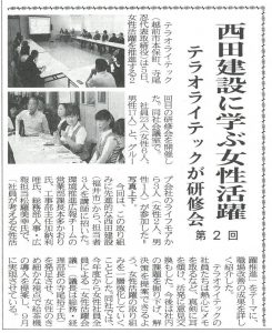 NEWS お知らせ TOP メディア掲載 テラオライテック㈱様 社内研修 テラオライテック㈱様 社内研修 2019.10.05 テラオライテック㈱様の社内研修にて、 「社員が考える女性活躍推進」をテーマに、 講師としてご協力させていただきました。 建設工業新聞 研修会終了後、 テラオライテック女性活躍会議の皆様と 意見交換会をかねて、ランチ会をおこないました。 美味しいご飯をいただきながら( *´艸`) お互いの取組についてお話しすることができました。 戻る 一覧へ 次へ 新着情報 永平寺大燈籠流しの清掃に参加しました。 丸岡宿泊型自立訓練事業所新築工事を受注しました。 小松(7)宿舎改修建築その1 を受注しました。 福井警察署 森田交番新築工事を受注しました。 公益財団法人 全国法人会総連合様から表彰されました カテゴリ インターンシップ 採用情報 現場見学会 メディア掲載 講演活動 令和7年度 令和6年度 令和5年度 令和4年度 令和3年度 令和2年度 令和元年度 平成30年度 平成29年度 平成28年度 平成27年度 平成26年度 平成25年度 平成24年度 平成23年度 アーカイブ 2025 (10) 2024 (30) 2023 (24) 2022 (21) 2021 (24) 2020 (30) 2019 (58) 2018 (57) 2017 (39) 2016 (34) 2015 (22) 2014 (14) 2013 (14) 2012 (11) 2011 (7) 新着情報 永平寺大燈籠流しの清掃に参加しました。 丸岡宿泊型自立訓練事業所新築工事を受注しました。 小松(7)宿舎改修建築その1 を受注しました。 福井警察署 森田交番新築工事を受注しました。 公益財団法人 全国法人会総連合様から表彰されました カテゴリ インターンシップ 採用情報 現場見学会 メディア掲載 講演活動 令和7年度 令和6年度 令和5年度 令和4年度 令和3年度 令和2年度 令和元年度 平成30年度 平成29年度 平成28年度 平成27年度 平成26年度 平成25年度 平成24年度 平成23年度 アーカイブ 2025 (10) 2024 (30) 2023 (24) 2022 (21) 2021 (24) 2020 (30) 2019 (58) 2018 (57) 2017 (39) 2016 (34) 2015 (22) 2014 (14) 2013 (14) 2012 (11) 2011 (7)