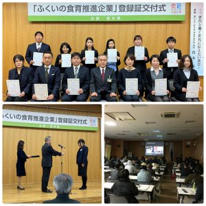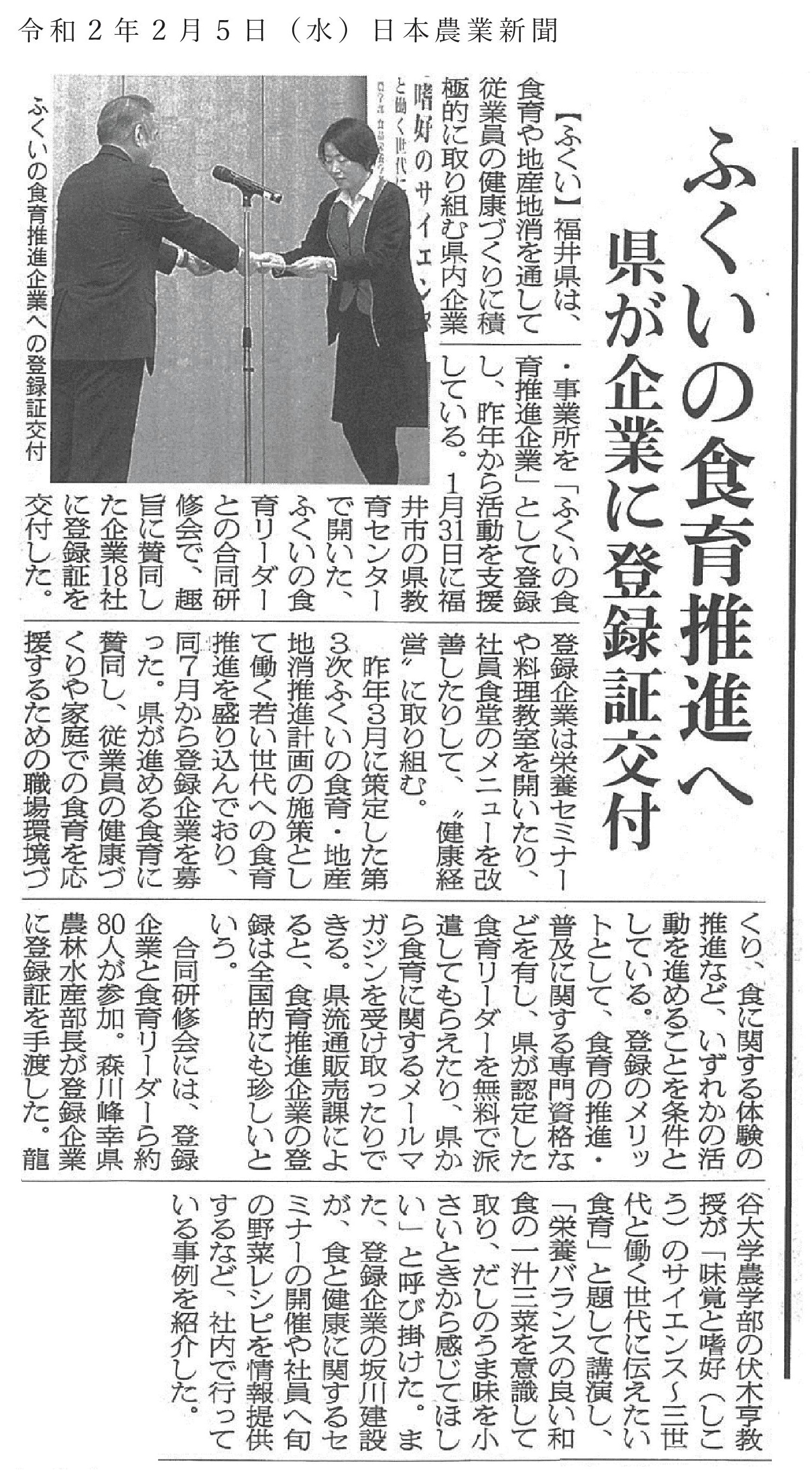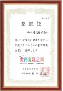 NEWS お知らせ TOP メディア掲載 ふくいの食育推進企業登録証交付式 ふくいの食育推進企業登録証交付式 2020.02.01 従業員の健康管理に関して、 食育や地産地消を取り入れて取り組む企業として、 ふくいの食育推進企業に登録しました。 健康で元気に働ける企業を目指し、生き生きとした生活を送るため、 健康管理をしっかり出来るようなサポート体制を強化しています。 戻る 一覧へ 次へ 新着情報 永平寺大燈籠流しの清掃に参加しました。 丸岡宿泊型自立訓練事業所新築工事を受注しました。 小松(7)宿舎改修建築その1 を受注しました。 福井警察署 森田交番新築工事を受注しました。 公益財団法人 全国法人会総連合様から表彰されました カテゴリ インターンシップ 採用情報 現場見学会 メディア掲載 講演活動 令和7年度 令和6年度 令和5年度 令和4年度 令和3年度 令和2年度 令和元年度 平成30年度 平成29年度 平成28年度 平成27年度 平成26年度 平成25年度 平成24年度 平成23年度 アーカイブ 2025 (10) 2024 (30) 2023 (24) 2022 (21) 2021 (24) 2020 (30) 2019 (58) 2018 (57) 2017 (39) 2016 (34) 2015 (22) 2014 (14) 2013 (14) 2012 (11) 2011 (7) 新着情報 永平寺大燈籠流しの清掃に参加しました。 丸岡宿泊型自立訓練事業所新築工事を受注しました。 小松(7)宿舎改修建築その1 を受注しました。 福井警察署 森田交番新築工事を受注しました。 公益財団法人 全国法人会総連合様から表彰されました カテゴリ インターンシップ 採用情報 現場見学会 メディア掲載 講演活動 令和7年度 令和6年度 令和5年度 令和4年度 令和3年度 令和2年度 令和元年度 平成30年度 平成29年度 平成28年度 平成27年度 平成26年度 平成25年度 平成24年度 平成23年度 アーカイブ 2025 (10) 2024 (30) 2023 (24) 2022 (21) 2021 (24) 2020 (30) 2019 (58) 2018 (57) 2017 (39) 2016 (34) 2015 (22) 2014 (14) 2013 (14) 2012 (11) 2011 (7)
