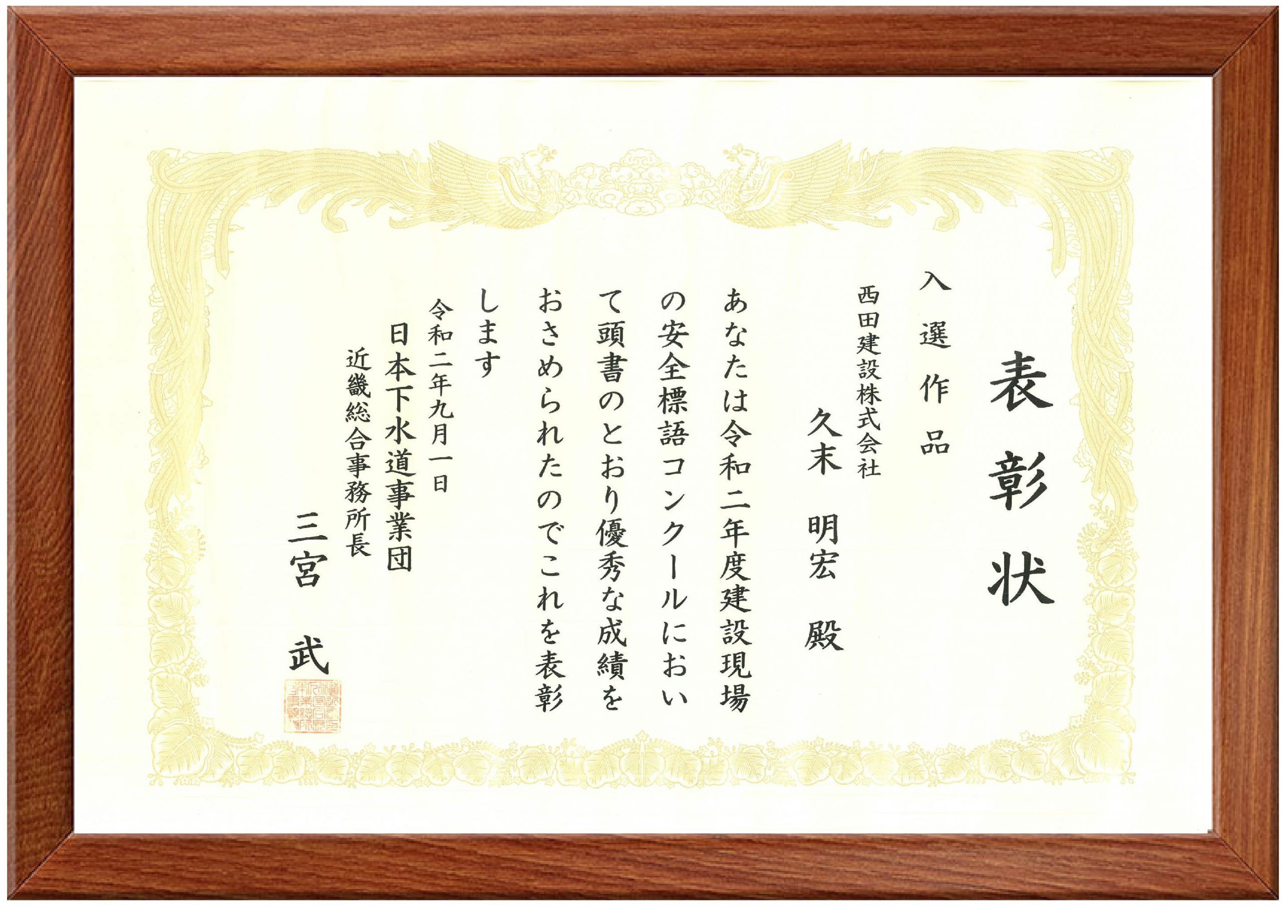 今回、日本下水道事業団 令和2年度建設現場安全標語コンクールにおいて 当社社員が入選し、表彰状を頂きました。   「ヒヤリハットの経験を 思い出しては忘れずに 基本手順でゼロ災害」