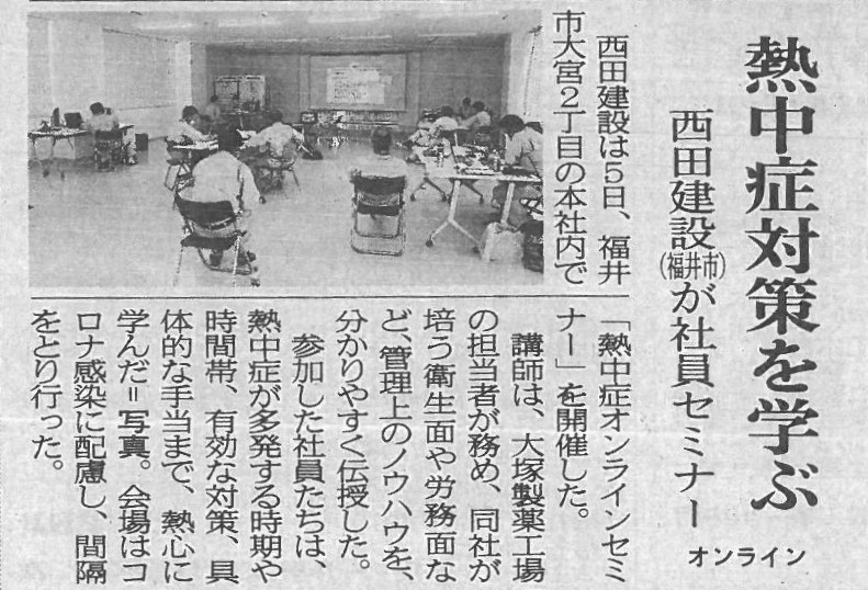 NEWS お知らせ TOP メディア掲載 熱中症オンラインセミナーを開催しました 熱中症オンラインセミナーを開催しました 2021.06.05 本社にて 熱中症オンラインセミナーを開催しました。 大塚製薬工場の方に講義をして頂き 多発する時期や時間・対策や具体的な手当など 管理上のノウハウを学びました。 今回 教えて頂いたことを生かして より安全な現場にしていきたいと思います。 建設工業新聞 戻る 一覧へ 次へ 新着情報 永平寺大燈籠流しの清掃に参加しました。 丸岡宿泊型自立訓練事業所新築工事を受注しました。 小松(7)宿舎改修建築その1 を受注しました。 福井警察署 森田交番新築工事を受注しました。 公益財団法人 全国法人会総連合様から表彰されました カテゴリ インターンシップ 採用情報 現場見学会 メディア掲載 講演活動 令和7年度 令和6年度 令和5年度 令和4年度 令和3年度 令和2年度 令和元年度 平成30年度 平成29年度 平成28年度 平成27年度 平成26年度 平成25年度 平成24年度 平成23年度 アーカイブ 2025 (10) 2024 (30) 2023 (24) 2022 (21) 2021 (24) 2020 (30) 2019 (58) 2018 (57) 2017 (39) 2016 (34) 2015 (22) 2014 (14) 2013 (14) 2012 (11) 2011 (7) 新着情報 永平寺大燈籠流しの清掃に参加しました。 丸岡宿泊型自立訓練事業所新築工事を受注しました。 小松(7)宿舎改修建築その1 を受注しました。 福井警察署 森田交番新築工事を受注しました。 公益財団法人 全国法人会総連合様から表彰されました カテゴリ インターンシップ 採用情報 現場見学会 メディア掲載 講演活動 令和7年度 令和6年度 令和5年度 令和4年度 令和3年度 令和2年度 令和元年度 平成30年度 平成29年度 平成28年度 平成27年度 平成26年度 平成25年度 平成24年度 平成23年度 アーカイブ 2025 (10) 2024 (30) 2023 (24) 2022 (21) 2021 (24) 2020 (30) 2019 (58) 2018 (57) 2017 (39) 2016 (34) 2015 (22) 2014 (14) 2013 (14) 2012 (11) 2011 (7)