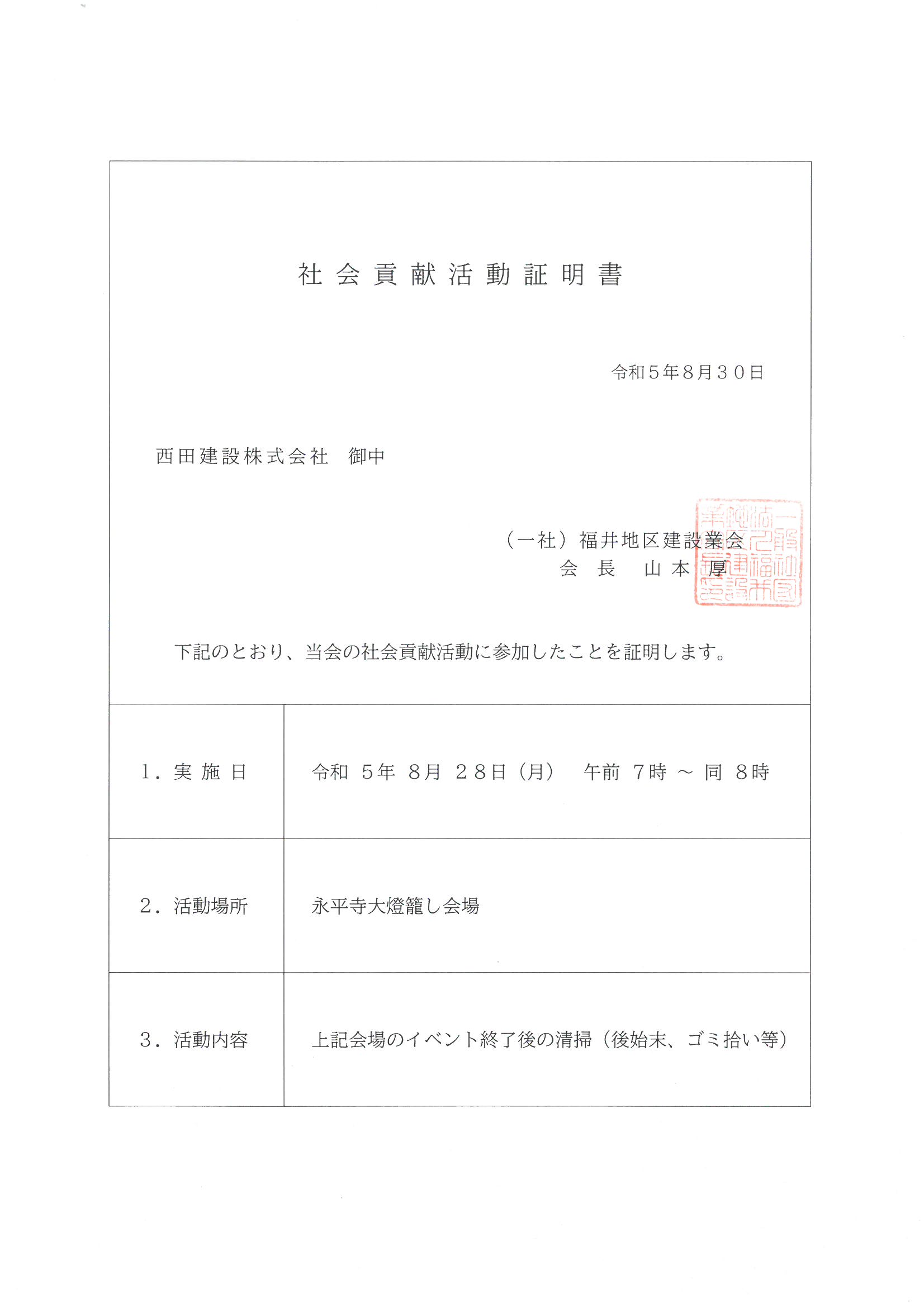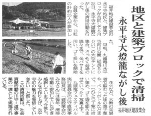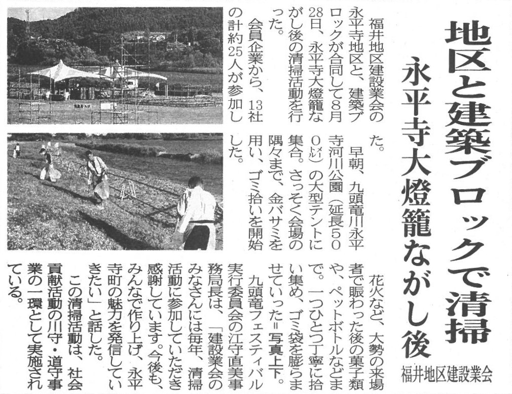 NEWS お知らせ TOP 令和5年度 *川守事業*永平寺大灯篭流し会場の清掃を行いました。 *川守事業*永平寺大灯篭流し会場の清掃を行いました。 2023.08.28 川守推進事業の一環として、 永平寺大灯篭流し会場の清掃に参加してきました。 戻る 一覧へ 次へ 新着情報 永平寺大燈籠流しの清掃に参加しました。 丸岡宿泊型自立訓練事業所新築工事を受注しました。 小松(7)宿舎改修建築その1 を受注しました。 福井警察署 森田交番新築工事を受注しました。 公益財団法人 全国法人会総連合様から表彰されました カテゴリ インターンシップ 採用情報 現場見学会 メディア掲載 講演活動 令和7年度 令和6年度 令和5年度 令和4年度 令和3年度 令和2年度 令和元年度 平成30年度 平成29年度 平成28年度 平成27年度 平成26年度 平成25年度 平成24年度 平成23年度 アーカイブ 2025 (10) 2024 (30) 2023 (24) 2022 (21) 2021 (24) 2020 (30) 2019 (58) 2018 (57) 2017 (39) 2016 (34) 2015 (22) 2014 (14) 2013 (14) 2012 (11) 2011 (7) 新着情報 永平寺大燈籠流しの清掃に参加しました。 丸岡宿泊型自立訓練事業所新築工事を受注しました。 小松(7)宿舎改修建築その1 を受注しました。 福井警察署 森田交番新築工事を受注しました。 公益財団法人 全国法人会総連合様から表彰されました カテゴリ インターンシップ 採用情報 現場見学会 メディア掲載 講演活動 令和7年度 令和6年度 令和5年度 令和4年度 令和3年度 令和2年度 令和元年度 平成30年度 平成29年度 平成28年度 平成27年度 平成26年度 平成25年度 平成24年度 平成23年度 アーカイブ 2025 (10) 2024 (30) 2023 (24) 2022 (21) 2021 (24) 2020 (30) 2019 (58) 2018 (57) 2017 (39) 2016 (34) 2015 (22) 2014 (14) 2013 (14) 2012 (11) 2011 (7)