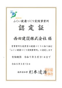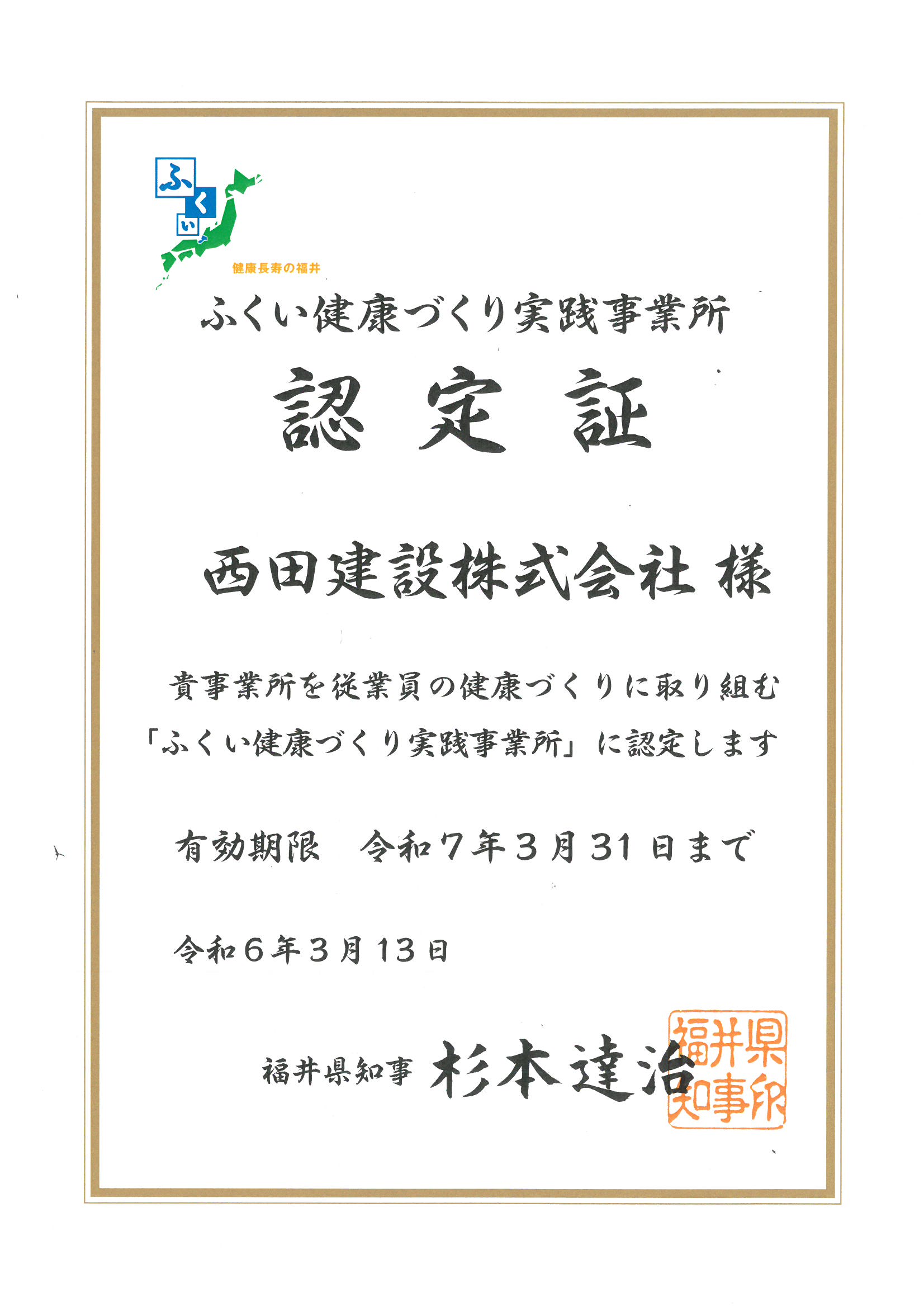 NEWS お知らせ TOP 令和6年度 ふくい健康づくり実践事業所に認定されました ふくい健康づくり実践事業所に認定されました 2024.04.02 福井県より 働き世代の健康づくりを活性化するため、 従業員の健康づくりに取り組む事業所として 「ふくい健康づくり実践事業所」に認定されました。 一覧へ 次へ 新着情報 永平寺大燈籠流しの清掃に参加しました。 丸岡宿泊型自立訓練事業所新築工事を受注しました。 小松(7)宿舎改修建築その1 を受注しました。 福井警察署 森田交番新築工事を受注しました。 公益財団法人 全国法人会総連合様から表彰されました カテゴリ インターンシップ 採用情報 現場見学会 メディア掲載 講演活動 令和7年度 令和6年度 令和5年度 令和4年度 令和3年度 令和2年度 令和元年度 平成30年度 平成29年度 平成28年度 平成27年度 平成26年度 平成25年度 平成24年度 平成23年度 アーカイブ 2025 (10) 2024 (30) 2023 (24) 2022 (21) 2021 (24) 2020 (30) 2019 (58) 2018 (57) 2017 (39) 2016 (34) 2015 (22) 2014 (14) 2013 (14) 2012 (11) 2011 (7) 新着情報 永平寺大燈籠流しの清掃に参加しました。 丸岡宿泊型自立訓練事業所新築工事を受注しました。 小松(7)宿舎改修建築その1 を受注しました。 福井警察署 森田交番新築工事を受注しました。 公益財団法人 全国法人会総連合様から表彰されました カテゴリ インターンシップ 採用情報 現場見学会 メディア掲載 講演活動 令和7年度 令和6年度 令和5年度 令和4年度 令和3年度 令和2年度 令和元年度 平成30年度 平成29年度 平成28年度 平成27年度 平成26年度 平成25年度 平成24年度 平成23年度 アーカイブ 2025 (10) 2024 (30) 2023 (24) 2022 (21) 2021 (24) 2020 (30) 2019 (58) 2018 (57) 2017 (39) 2016 (34) 2015 (22) 2014 (14) 2013 (14) 2012 (11) 2011 (7)