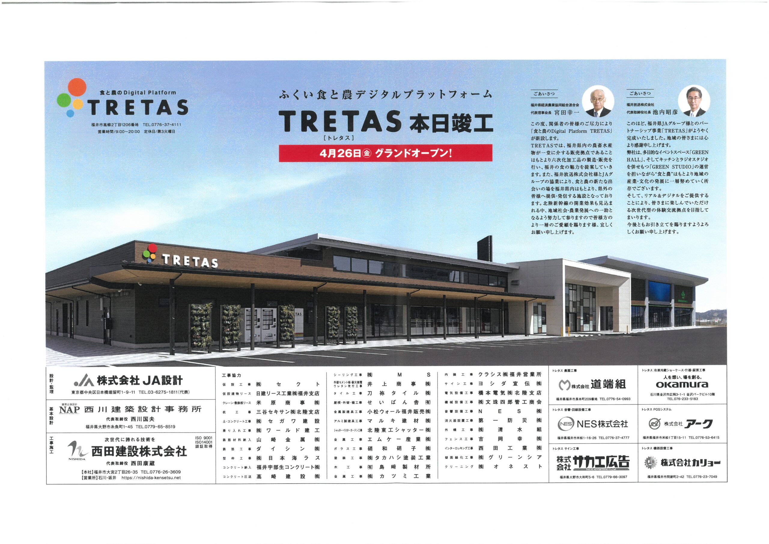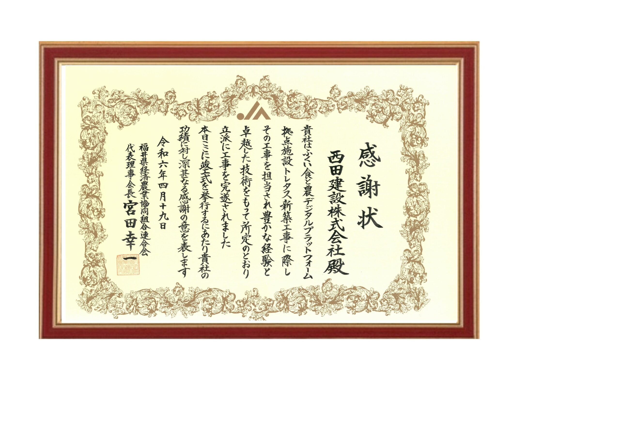 NEWS お知らせ TOP 令和6年度 ふくい食と農デジタルプラットフォーム新築工事 竣工式 ふくい食と農デジタルプラットフォーム新築工事 竣工式 2024.04.19 ふくい食と農デジタルプラットフォーム新築工事 竣工式が行われました。 戻る 一覧へ 次へ 新着情報 永平寺大燈籠流しの清掃に参加しました。 丸岡宿泊型自立訓練事業所新築工事を受注しました。 小松(7)宿舎改修建築その1 を受注しました。 福井警察署 森田交番新築工事を受注しました。 公益財団法人 全国法人会総連合様から表彰されました カテゴリ インターンシップ 採用情報 現場見学会 メディア掲載 講演活動 令和7年度 令和6年度 令和5年度 令和4年度 令和3年度 令和2年度 令和元年度 平成30年度 平成29年度 平成28年度 平成27年度 平成26年度 平成25年度 平成24年度 平成23年度 アーカイブ 2025 (10) 2024 (30) 2023 (24) 2022 (21) 2021 (24) 2020 (30) 2019 (58) 2018 (57) 2017 (39) 2016 (34) 2015 (22) 2014 (14) 2013 (14) 2012 (11) 2011 (7) 新着情報 永平寺大燈籠流しの清掃に参加しました。 丸岡宿泊型自立訓練事業所新築工事を受注しました。 小松(7)宿舎改修建築その1 を受注しました。 福井警察署 森田交番新築工事を受注しました。 公益財団法人 全国法人会総連合様から表彰されました カテゴリ インターンシップ 採用情報 現場見学会 メディア掲載 講演活動 令和7年度 令和6年度 令和5年度 令和4年度 令和3年度 令和2年度 令和元年度 平成30年度 平成29年度 平成28年度 平成27年度 平成26年度 平成25年度 平成24年度 平成23年度 アーカイブ 2025 (10) 2024 (30) 2023 (24) 2022 (21) 2021 (24) 2020 (30) 2019 (58) 2018 (57) 2017 (39) 2016 (34) 2015 (22) 2014 (14) 2013 (14) 2012 (11) 2011 (7)