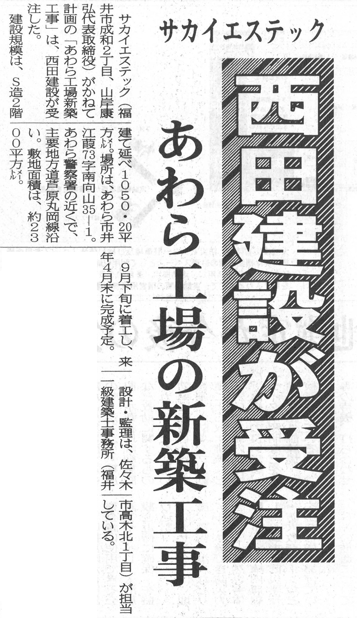 NEWS お知らせ TOP 令和6年度 サカイエステックあわら工場新築工事を受注しました。 サカイエステックあわら工場新築工事を受注しました。 2024.09.04 サカイエステックあわら工場新築工事受注しました。 戻る 一覧へ 次へ 新着情報 永平寺大燈籠流しの清掃に参加しました。 丸岡宿泊型自立訓練事業所新築工事を受注しました。 小松(7)宿舎改修建築その1 を受注しました。 福井警察署 森田交番新築工事を受注しました。 公益財団法人 全国法人会総連合様から表彰されました カテゴリ インターンシップ 採用情報 現場見学会 メディア掲載 講演活動 令和7年度 令和6年度 令和5年度 令和4年度 令和3年度 令和2年度 令和元年度 平成30年度 平成29年度 平成28年度 平成27年度 平成26年度 平成25年度 平成24年度 平成23年度 アーカイブ 2025 (10) 2024 (30) 2023 (24) 2022 (21) 2021 (24) 2020 (30) 2019 (58) 2018 (57) 2017 (39) 2016 (34) 2015 (22) 2014 (14) 2013 (14) 2012 (11) 2011 (7) 新着情報 永平寺大燈籠流しの清掃に参加しました。 丸岡宿泊型自立訓練事業所新築工事を受注しました。 小松(7)宿舎改修建築その1 を受注しました。 福井警察署 森田交番新築工事を受注しました。 公益財団法人 全国法人会総連合様から表彰されました カテゴリ インターンシップ 採用情報 現場見学会 メディア掲載 講演活動 令和7年度 令和6年度 令和5年度 令和4年度 令和3年度 令和2年度 令和元年度 平成30年度 平成29年度 平成28年度 平成27年度 平成26年度 平成25年度 平成24年度 平成23年度 アーカイブ 2025 (10) 2024 (30) 2023 (24) 2022 (21) 2021 (24) 2020 (30) 2019 (58) 2018 (57) 2017 (39) 2016 (34) 2015 (22) 2014 (14) 2013 (14) 2012 (11) 2011 (7)